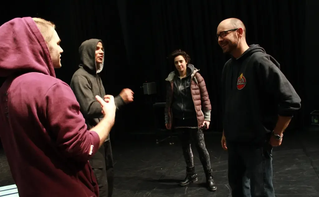Photo: Valentin „Knuffelbunt“ Alfery, Patrick Bongola, Nevena Lukic, and Josh Costello rehearse LITTLE BROTHER by Cory Doctorow, adapted by Josh Costello, translated by Caroline Richards. ARGEKultur Salzburg.